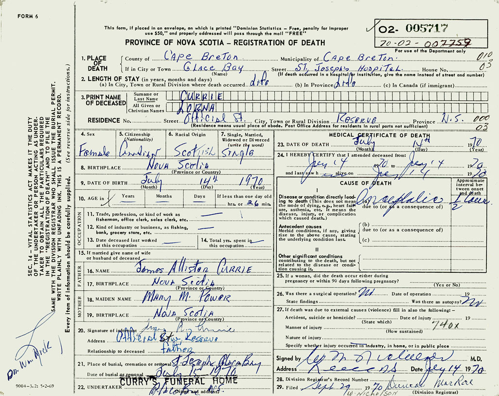 1. PLACE OF DEATH County of Cape Breton If in City or Town Glace Bay