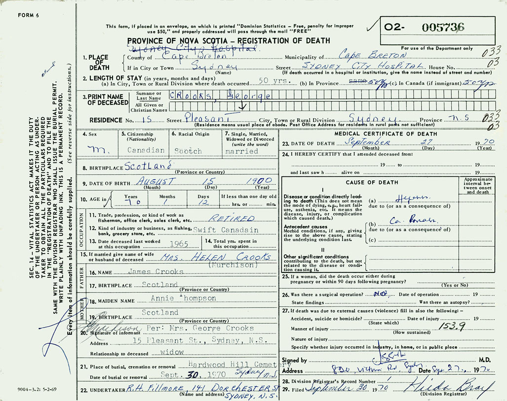 1. PLACE OF DEATH County of Cape Breton If in City or Town Sydney