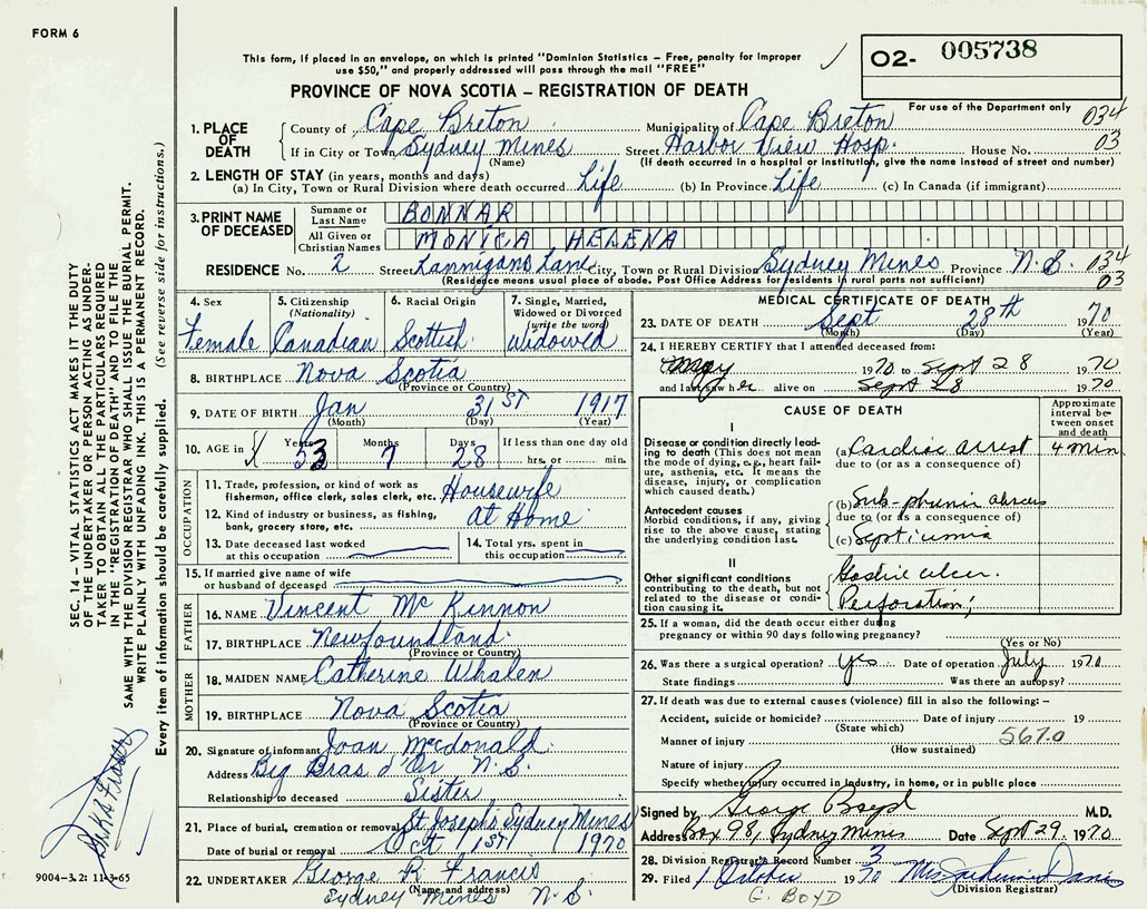 1. PLACE OF DEATH County of Cape Breton If in City or Town Sydney Mines