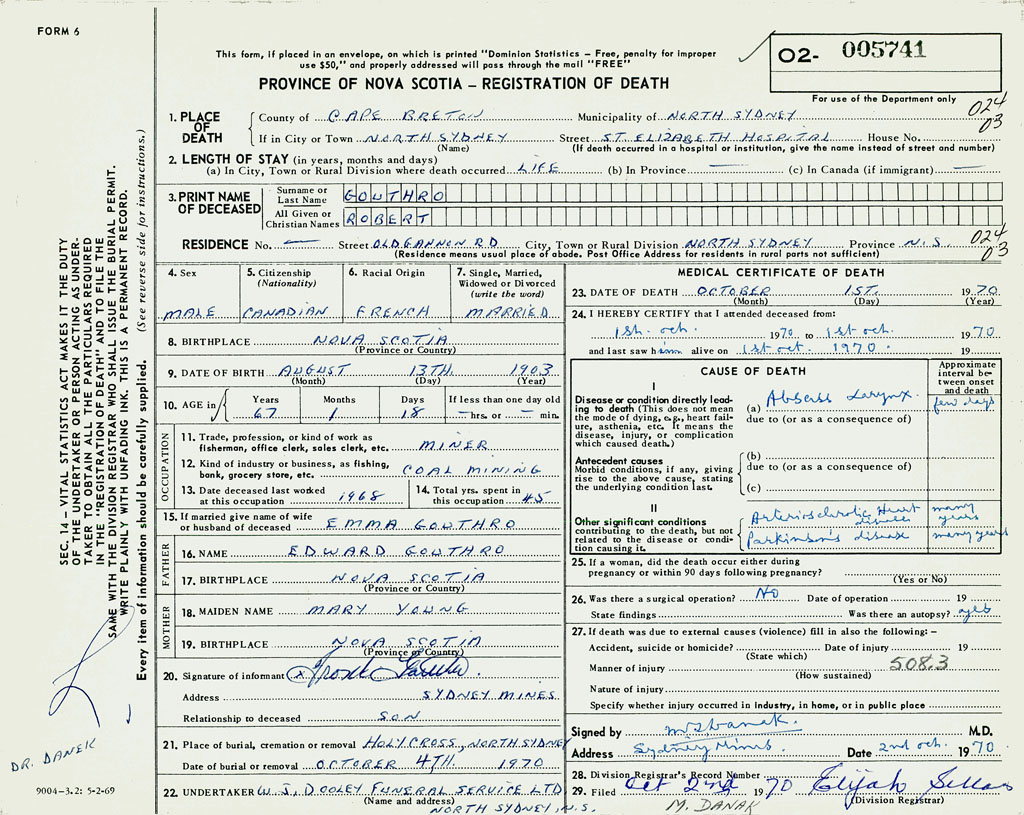 1. PLACE OF DEATH County of Cape Breton If in City or Town North Sydney