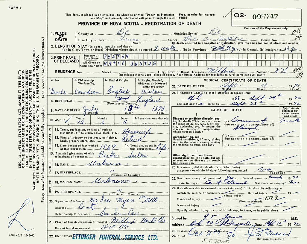 PROVINCE OF NOVA SCOTIA — REGISTRATION OF DEATH