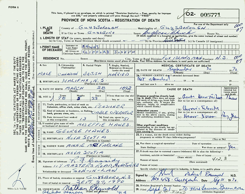 1. PLACE OF DEATH County of Guysborough If in City or Town Guysborough