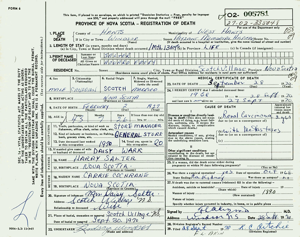 PROVINCE OF NOVA SCOTIA — REGISTRATION OF DEATH