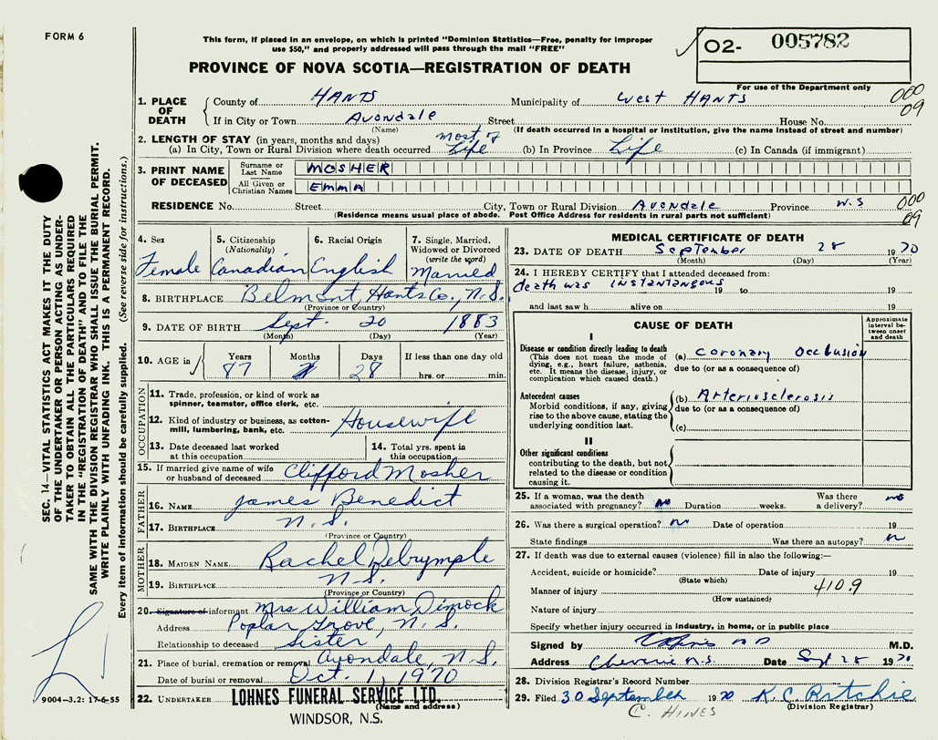 PROVINCE OF NOVA SCOTIA — REGISTRATION OF DEATH