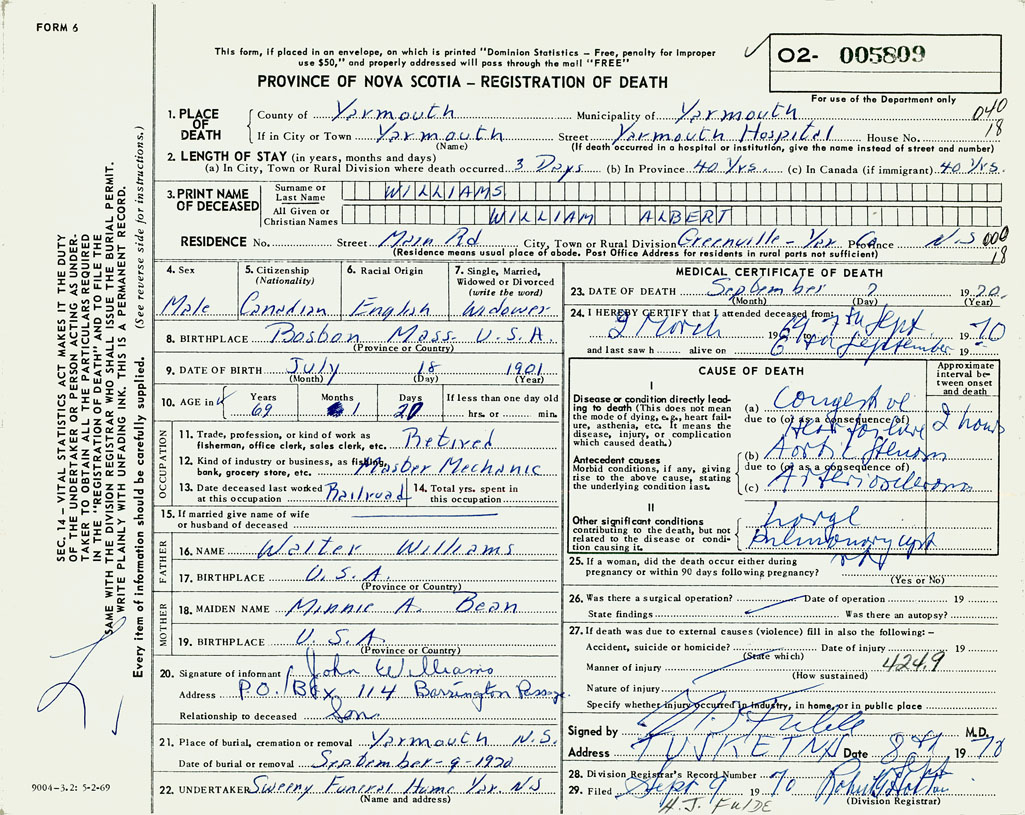 PROVINCE OF NOVA SCOTIA — REGISTRATION OF DEATH