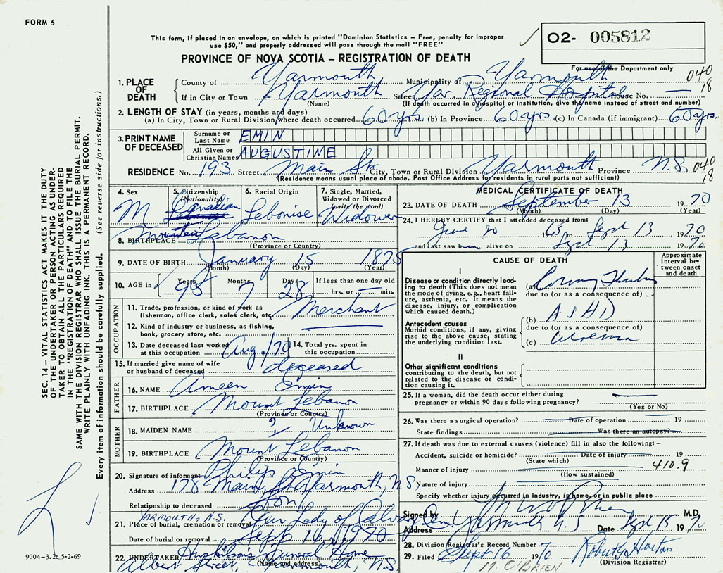 PROVINCE OF NOVA SCOTIA — REGISTRATION OF DEATH