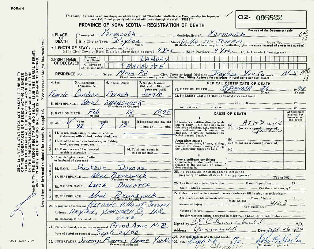21. Place of burial GrandAnse, New Brunswick