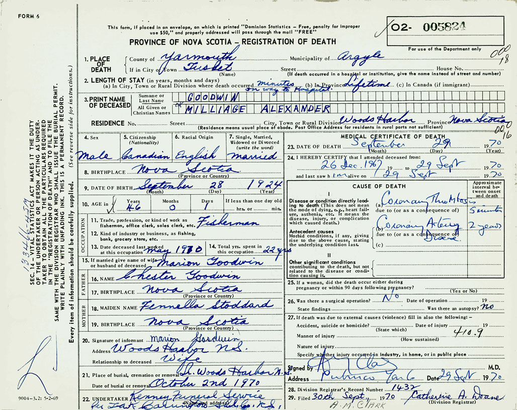 1. PLACE OF DEATH County of Yarmouth If in City or Town Tusket