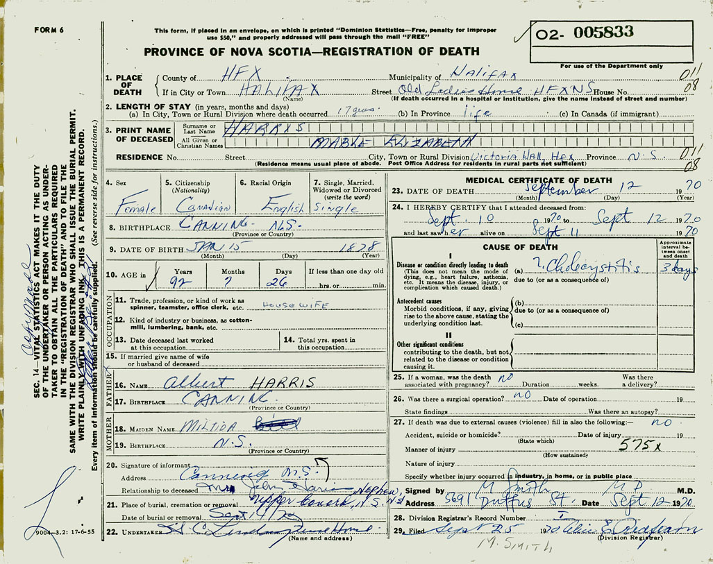 PROVINCE OF NOVA SCOTIA — REGISTRATION OF DEATH