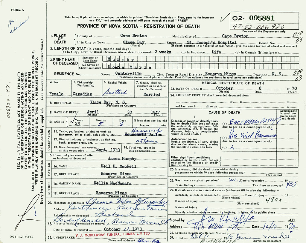 1. PLACE OF DEATH County of Cape Breton If in City or Town Glace Bay
