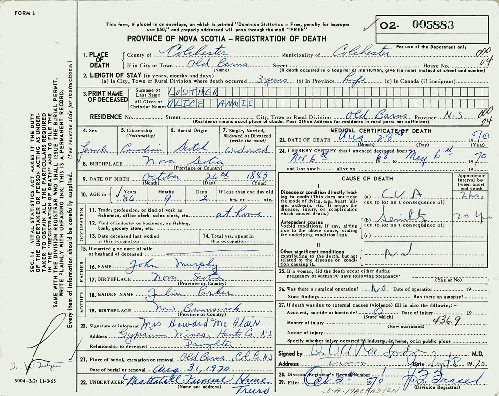 PROVINCE OF NOVA SCOTIA — REGISTRATION OF DEATH
