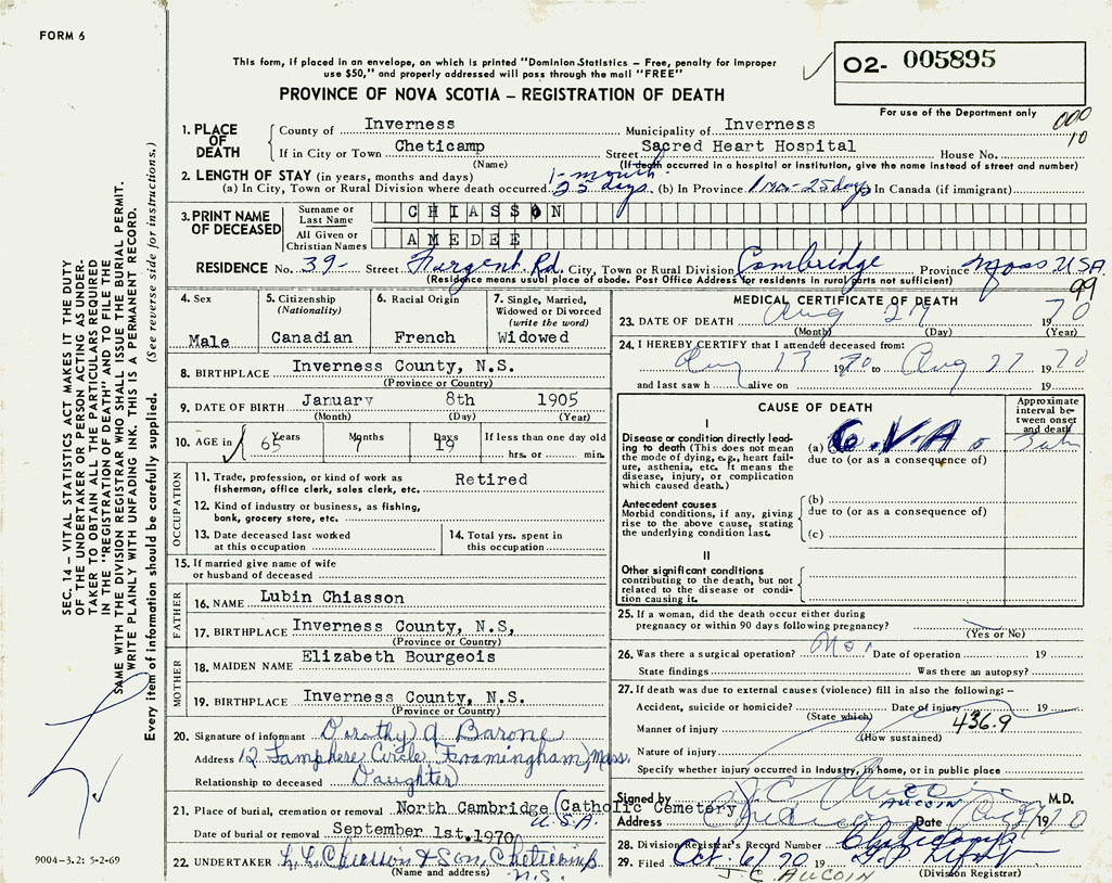 1. PLACE OF DEATH County of Inverness If in City or Town Cheticamp