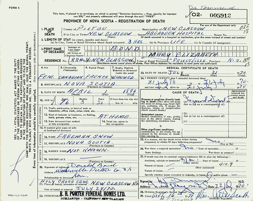 PROVINCE OF NOVA SCOTIA — REGISTRATION OF DEATH
