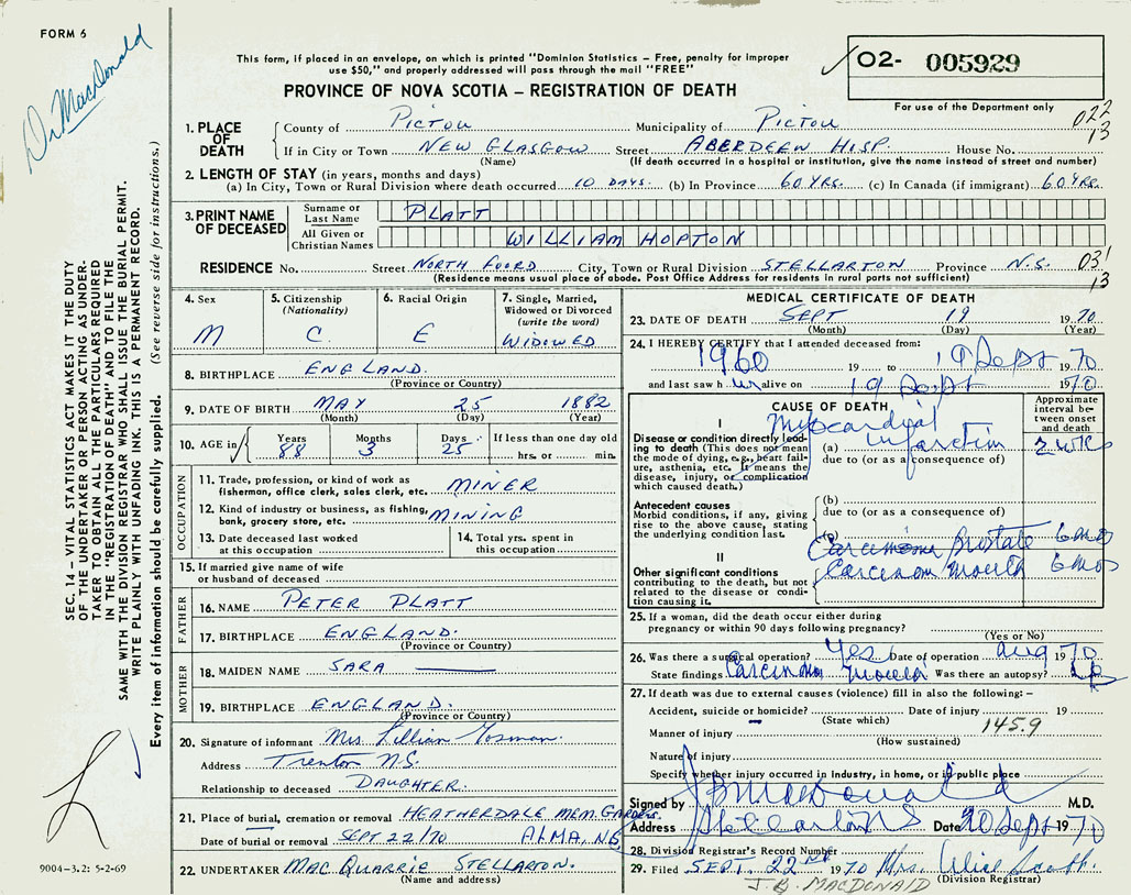 1. PLACE OF DEATH County of Pictou If in City or Town New Glasgow