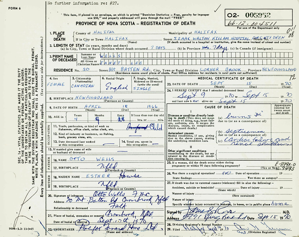 21. Place of burial Cornerbrook, Newfoundland
