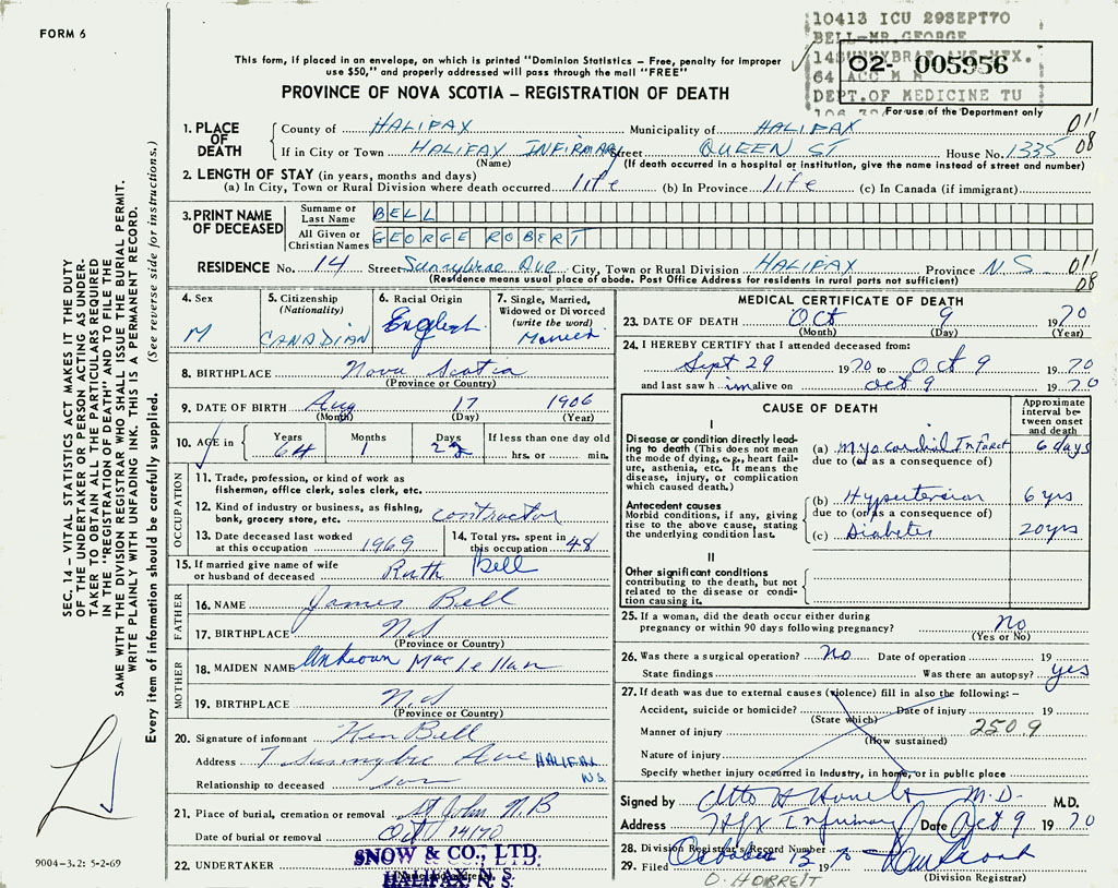PROVINCE OF NOVA SCOTIA — REGISTRATION OF DEATH