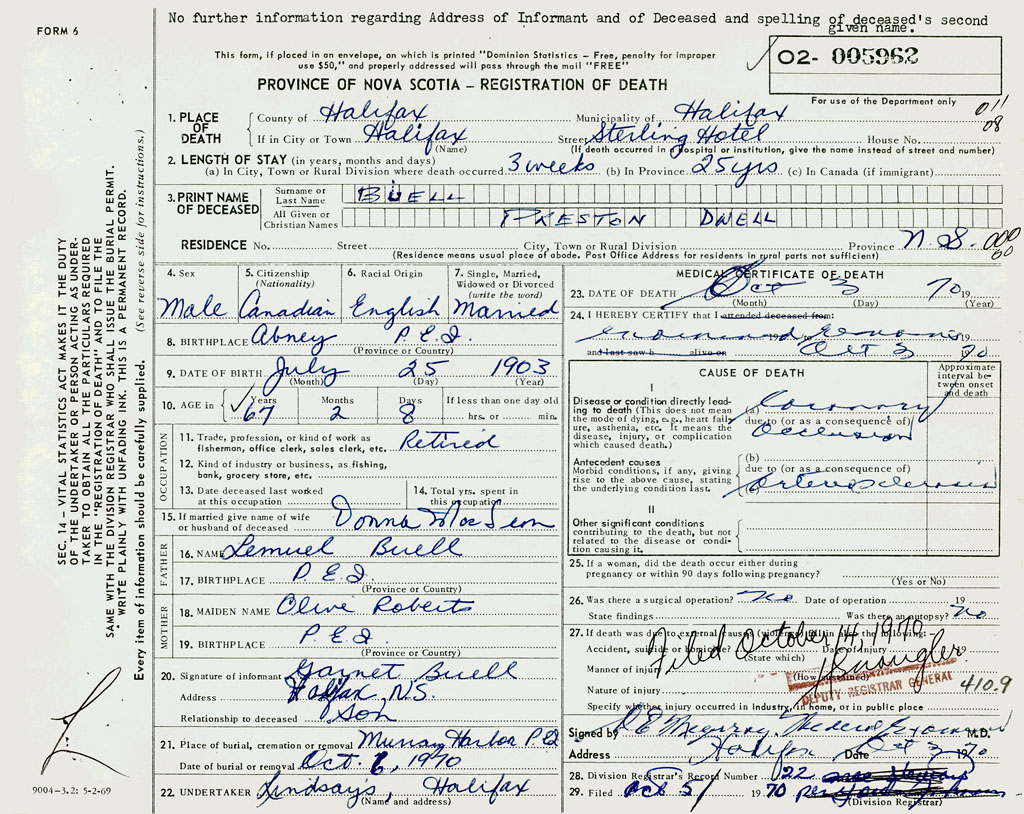 PROVINCE OF NOVA SCOTIA — REGISTRATION OF DEATH