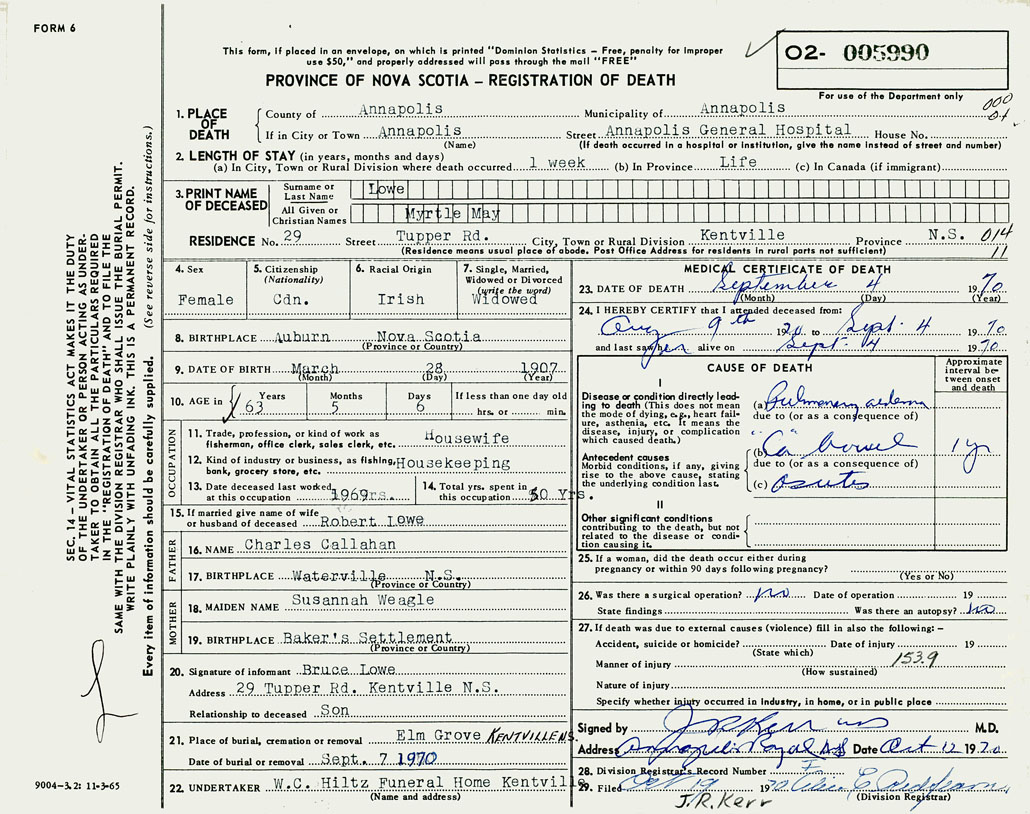 PROVINCE OF NOVA SCOTIA — REGISTRATION OF DEATH