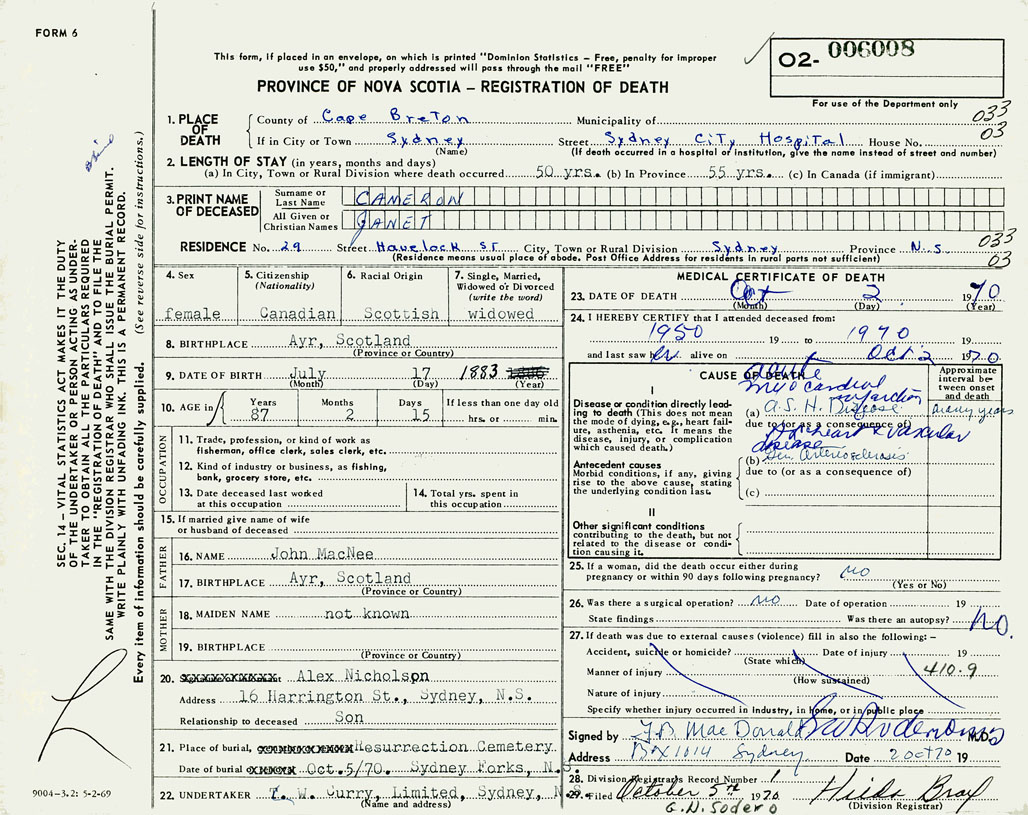 1. PLACE OF DEATH County of Cape Breton If in City or Town Sydney