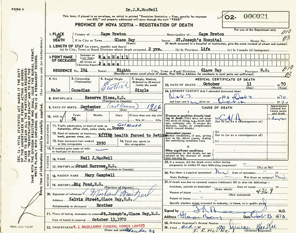 1. PLACE OF DEATH County of Cape Breton If in City or Town Glace Bay