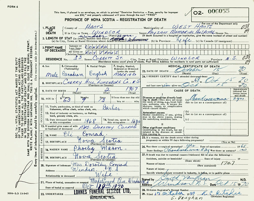 PROVINCE OF NOVA SCOTIA — REGISTRATION OF DEATH