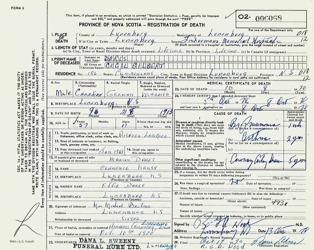22. Undertaker Dana L. Sweeny Funeral Home Ltd., Lunenburg