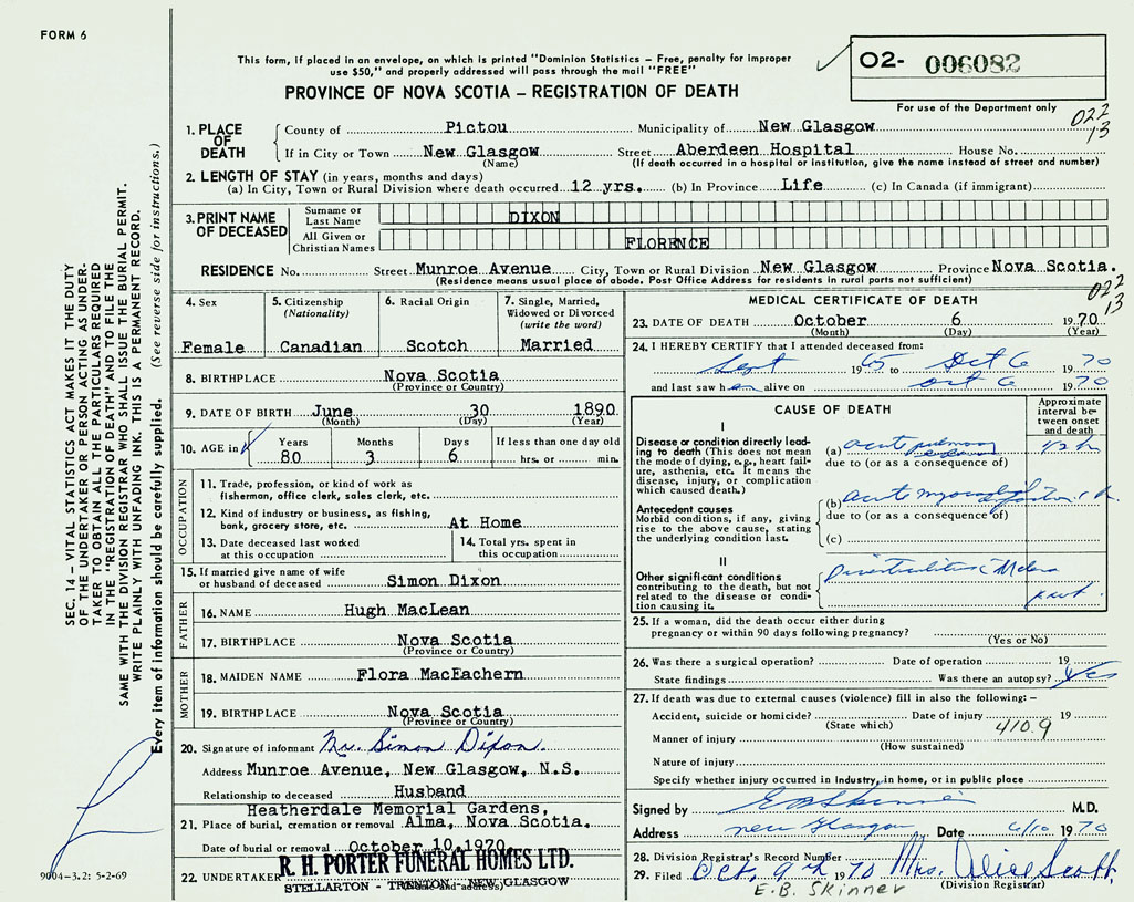 1. PLACE OF DEATH County of Pictou If in City or Town New Glasgow