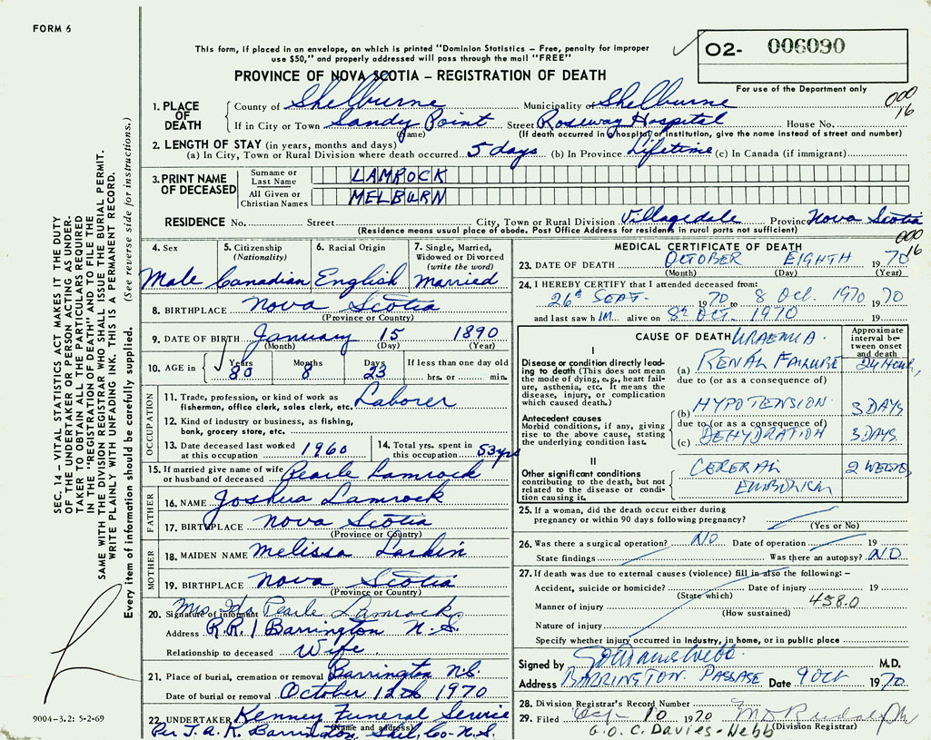 1. PLACE OF DEATH County of Shelburne If in City or Town Sandy Point