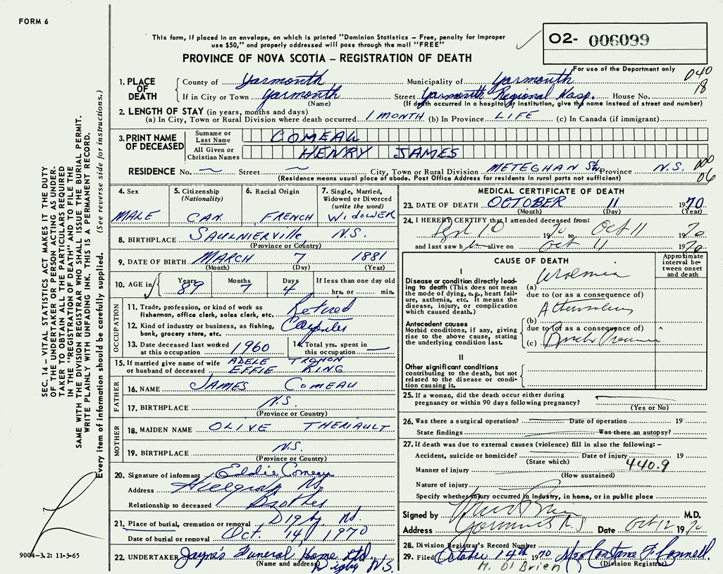 3. PRINT NAME OF DECEASED Comeau, Henry James