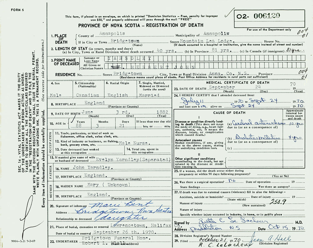 PROVINCE OF NOVA SCOTIA — REGISTRATION OF DEATH