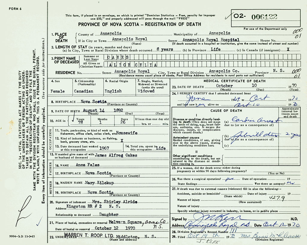 PROVINCE OF NOVA SCOTIA — REGISTRATION OF DEATH