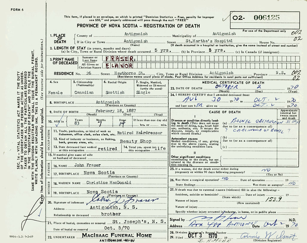 PROVINCE OF NOVA SCOTIA — REGISTRATION OF DEATH