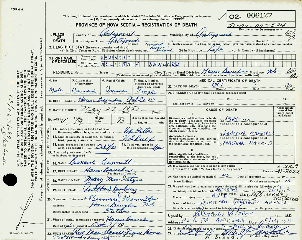 PROVINCE OF NOVA SCOTIA — REGISTRATION OF DEATH