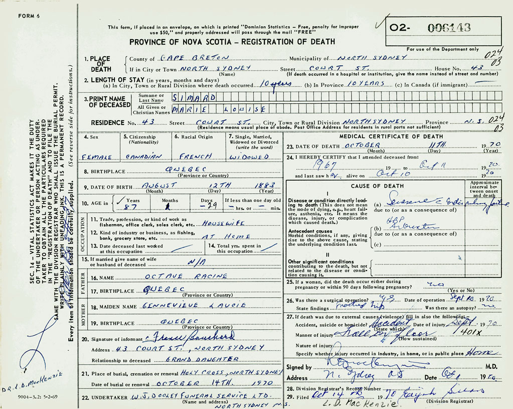 1. PLACE OF DEATH County of Cape Breton If in City or Town North Sydney