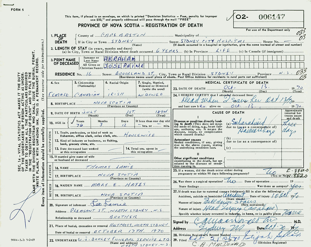 1. PLACE OF DEATH County of Cape Breton If in City or Town Sydney