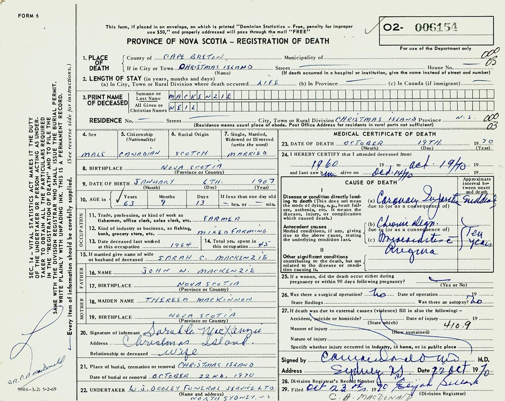 1. PLACE OF DEATH County of Cape Breton If in City or Town Christmas Island