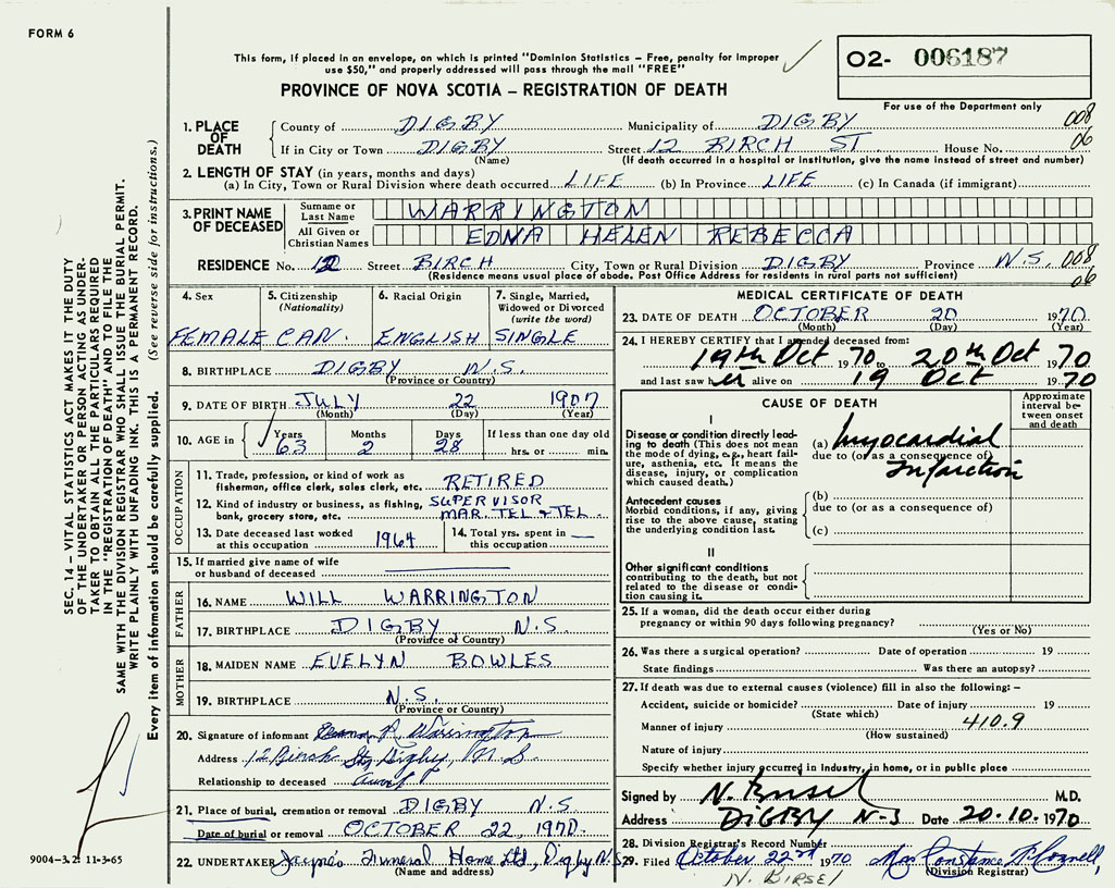 1. PLACE OF DEATH County of Digby If in City or Town Digby
