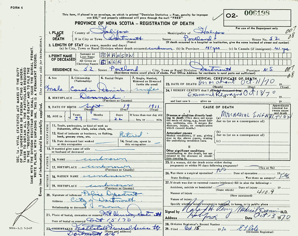 PROVINCE OF NOVA SCOTIA — REGISTRATION OF DEATH