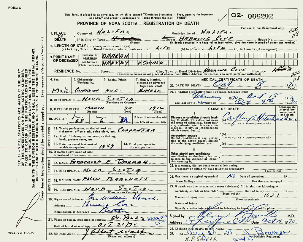 1. PLACE OF DEATH County of Halifax If in City or Town Herring Cove