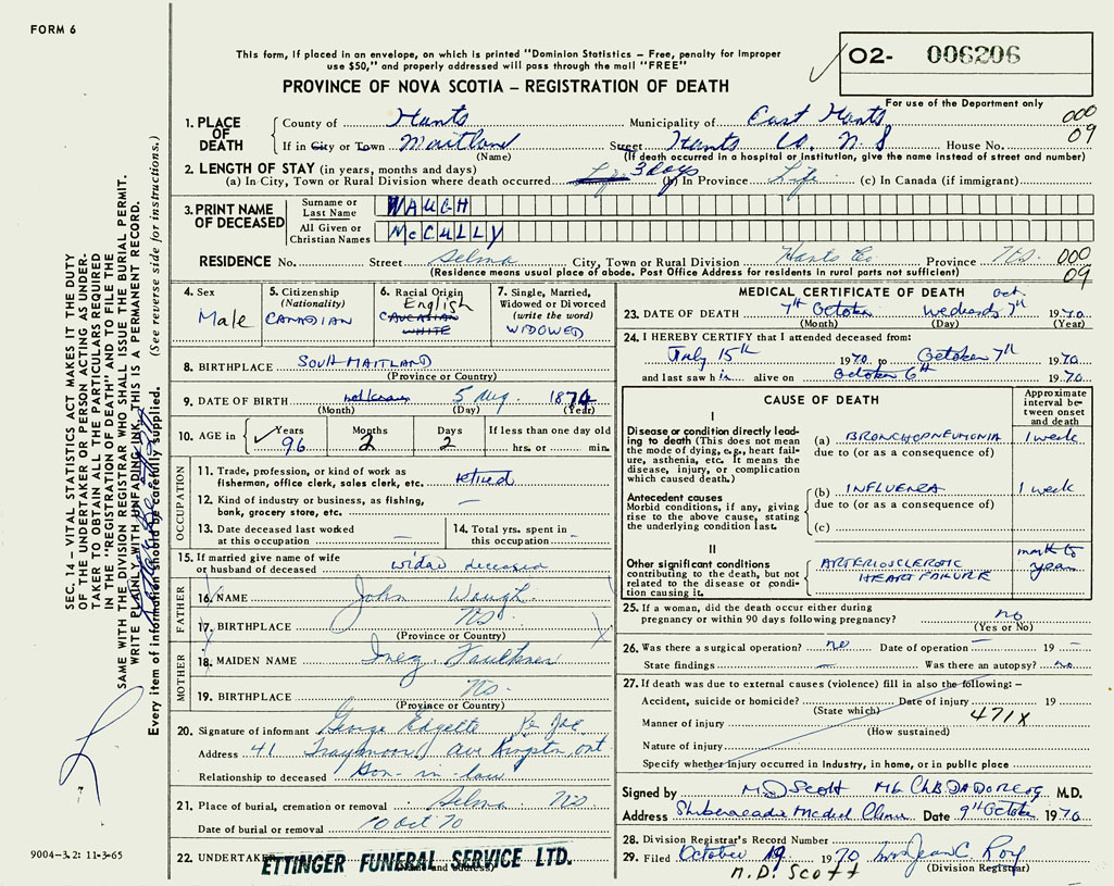 PROVINCE OF NOVA SCOTIA — REGISTRATION OF DEATH