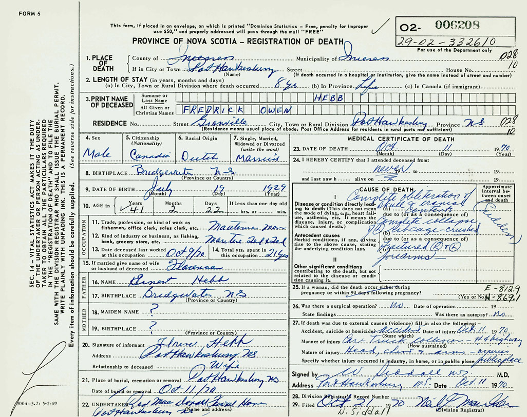 PROVINCE OF NOVA SCOTIA — REGISTRATION OF DEATH