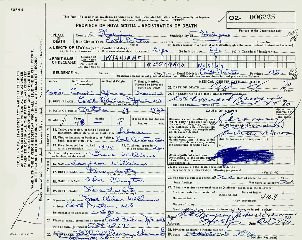 1. PLACE OF DEATH County of Halifax If in City or Town East Preston