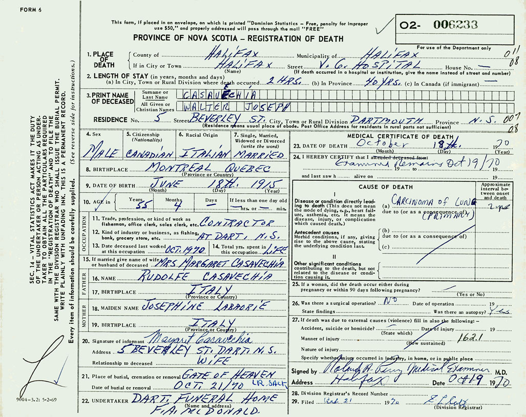 PROVINCE OF NOVA SCOTIA — REGISTRATION OF DEATH