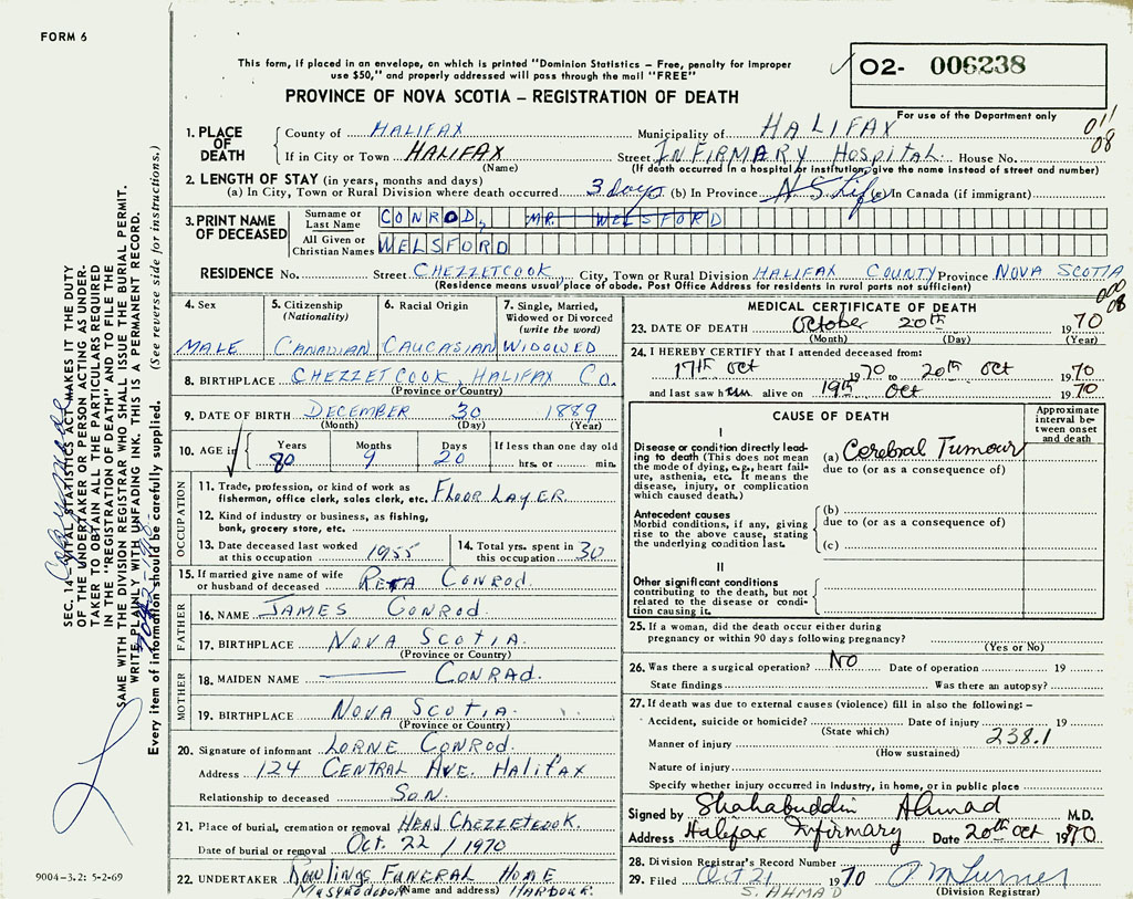 PROVINCE OF NOVA SCOTIA — REGISTRATION OF DEATH