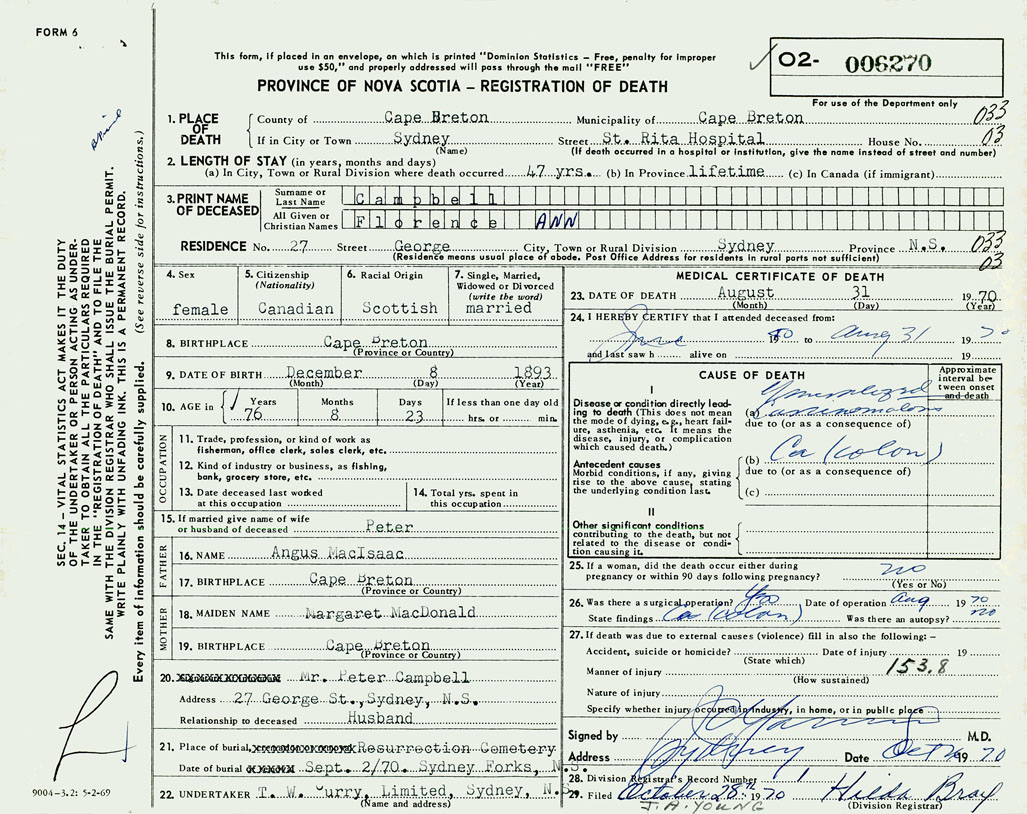 1. PLACE OF DEATH County of Cape Breton If in City or Town Sydney