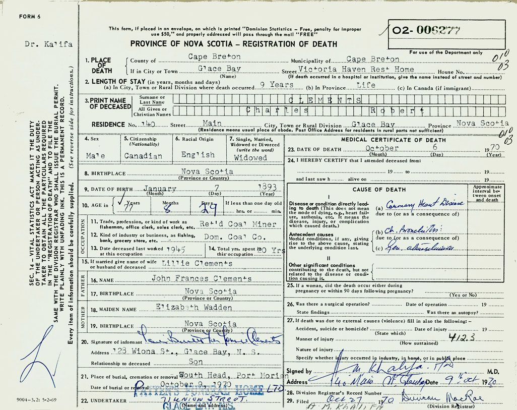1. PLACE OF DEATH County of Cape Breton If in City or Town Glace Bay