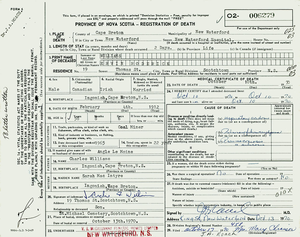 1. PLACE OF DEATH County of Cape Breton If in City or Town New Waterford