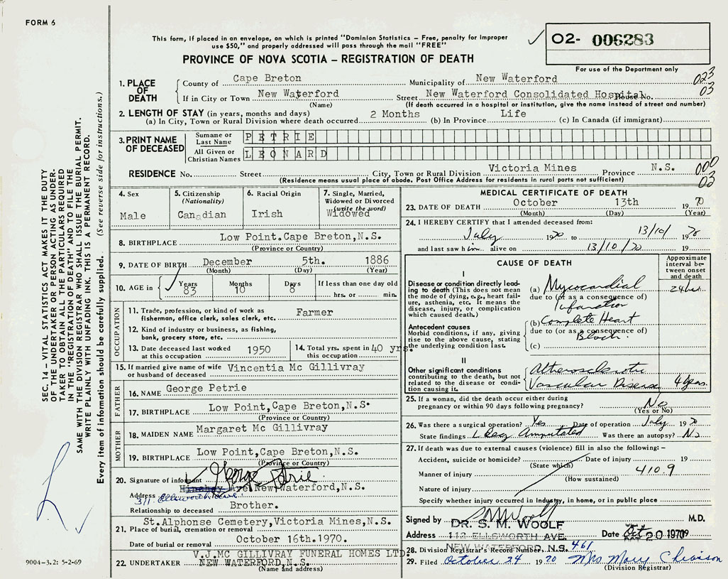 1. PLACE OF DEATH County of Cape Breton If in City or Town New Waterford