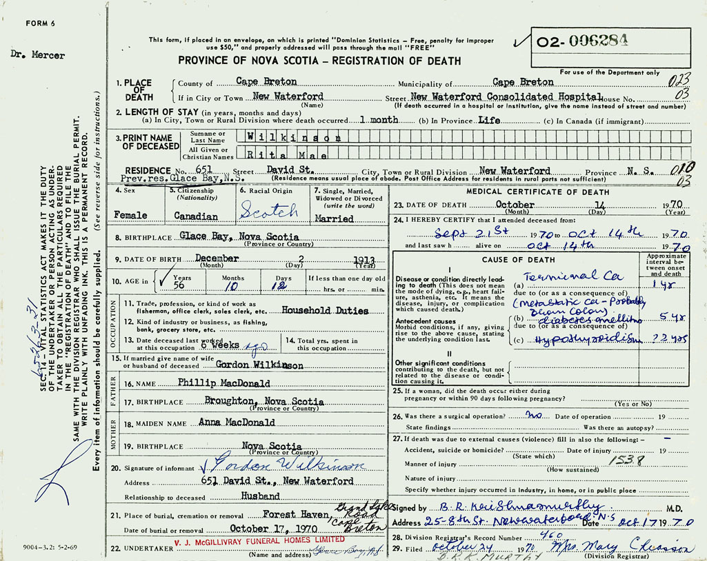 1. PLACE OF DEATH County of Cape Breton If in City or Town New Waterford
