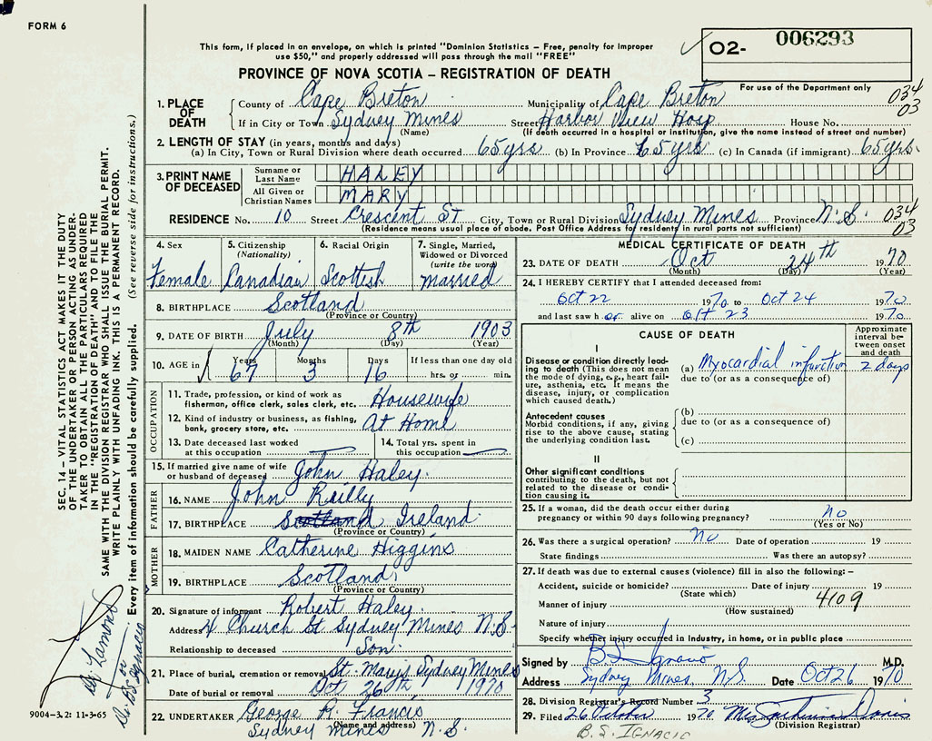 1. PLACE OF DEATH County of Cape Breton If in City or Town Sydney Mines